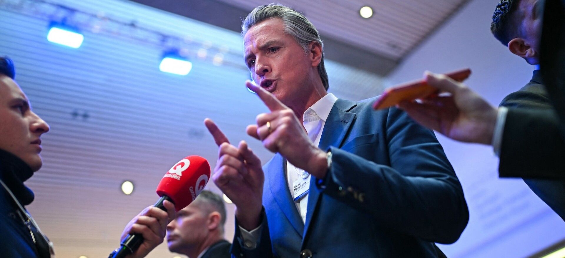 Gov. Gavin Newsom speaking to reporters in Davos.
