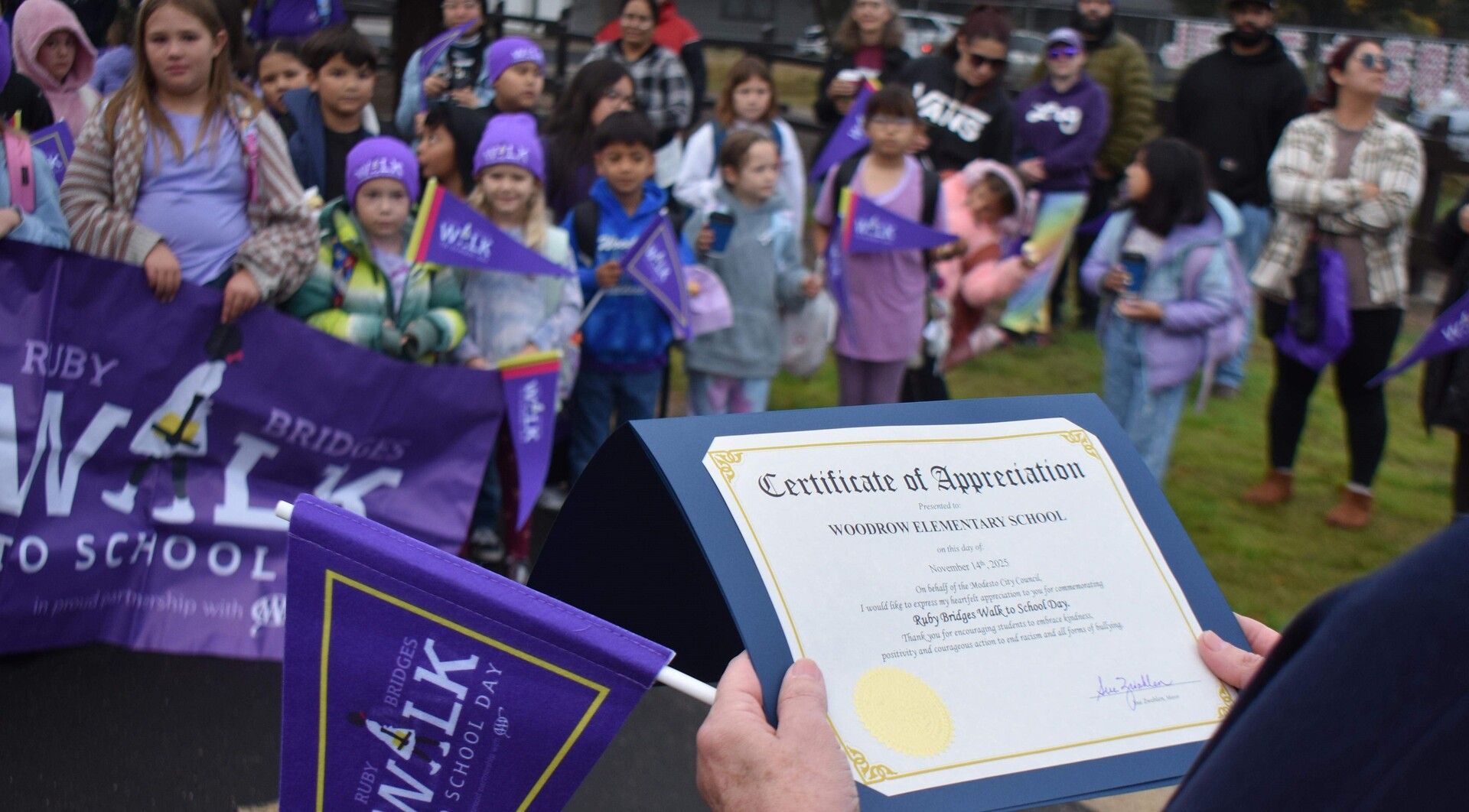 Synopsis: Students at Woodrow Elementary took part in Ruby Bridges Walk-to-School Day last Friday, meeting at Davis Park Church of Christ and walking a quarter mile down the Virginia Corridor to their school. Mayor Sue Zwahlen and councilmember Jeremiah Williams joined the students to commemorate the walk made by 6-year-old Ruby Bridges – accompanied by federal marshals -- to her new school in New Orleans. The children were given pennants, bags and caps from AAA.