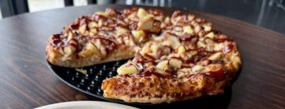 This thick-crust pizza has barbecued chicken.