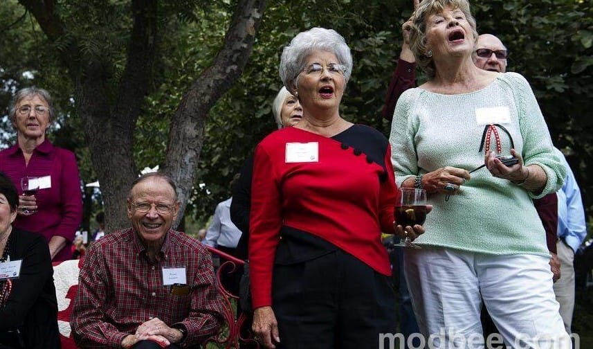 Roland Nyegaard, seated, enjoying the singing of his wife Kate, middle.