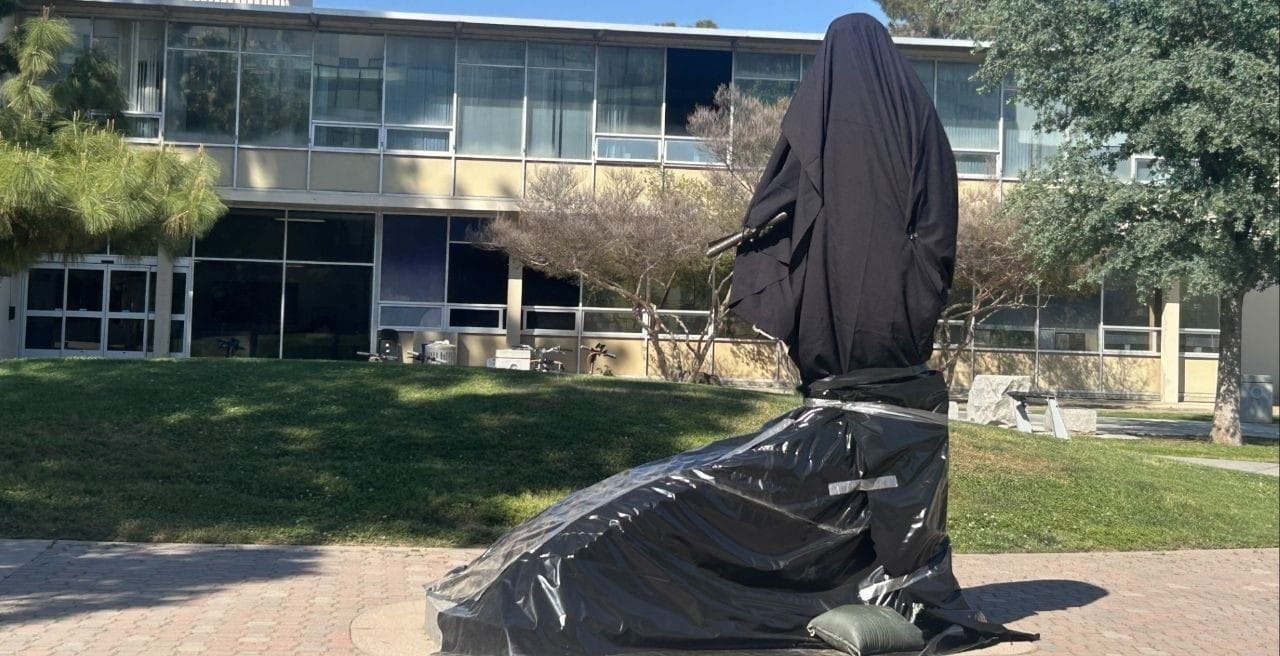 The statue of Cesar Chavez at Fresno State has been draped in black.
