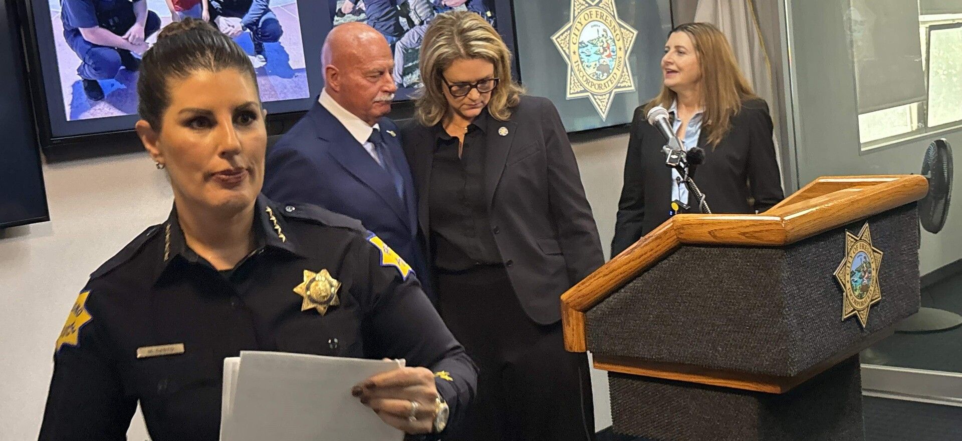 Fresno Chief Mindy Casto with Mayor Dyer in background.
