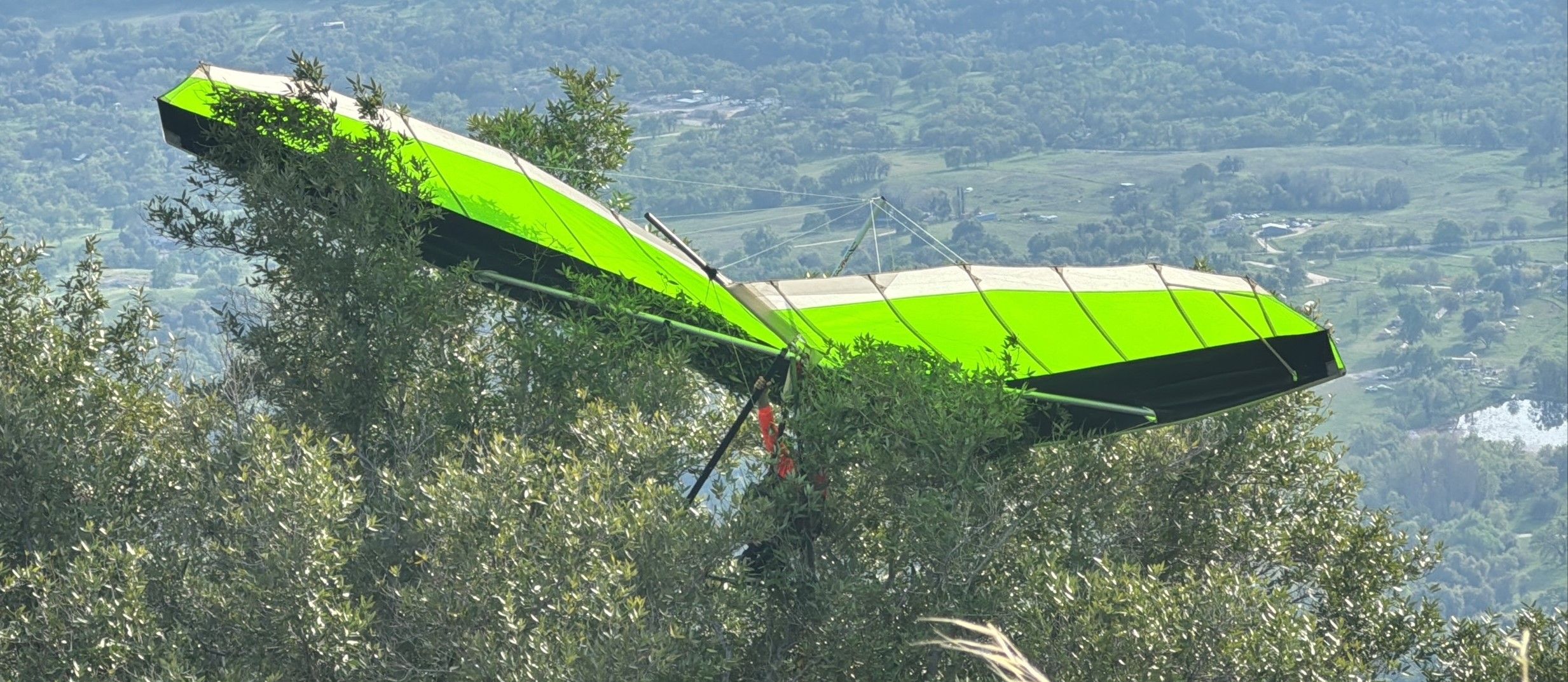 Synopsis: Crews from Cal Fire, the CHP and county emergency services responded to reports of a hang glider stuck in a tree on Sunday afternoon. The pilot sat in the tree for about an hour before being helped to safety. He was not injured. Embarrassed maybe but not hurt.