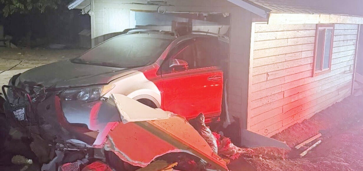 Synopsis: A 25-year-old woman from Dos Palos was driving her Rav 4 on Ward Road on Nov. 11 when she veered off the road, drove through a field then into a garage. The door wasn’t open. No matter. She crashed through the doors then out the back wall. Police say she failed a sobriety test. No one was hurt.